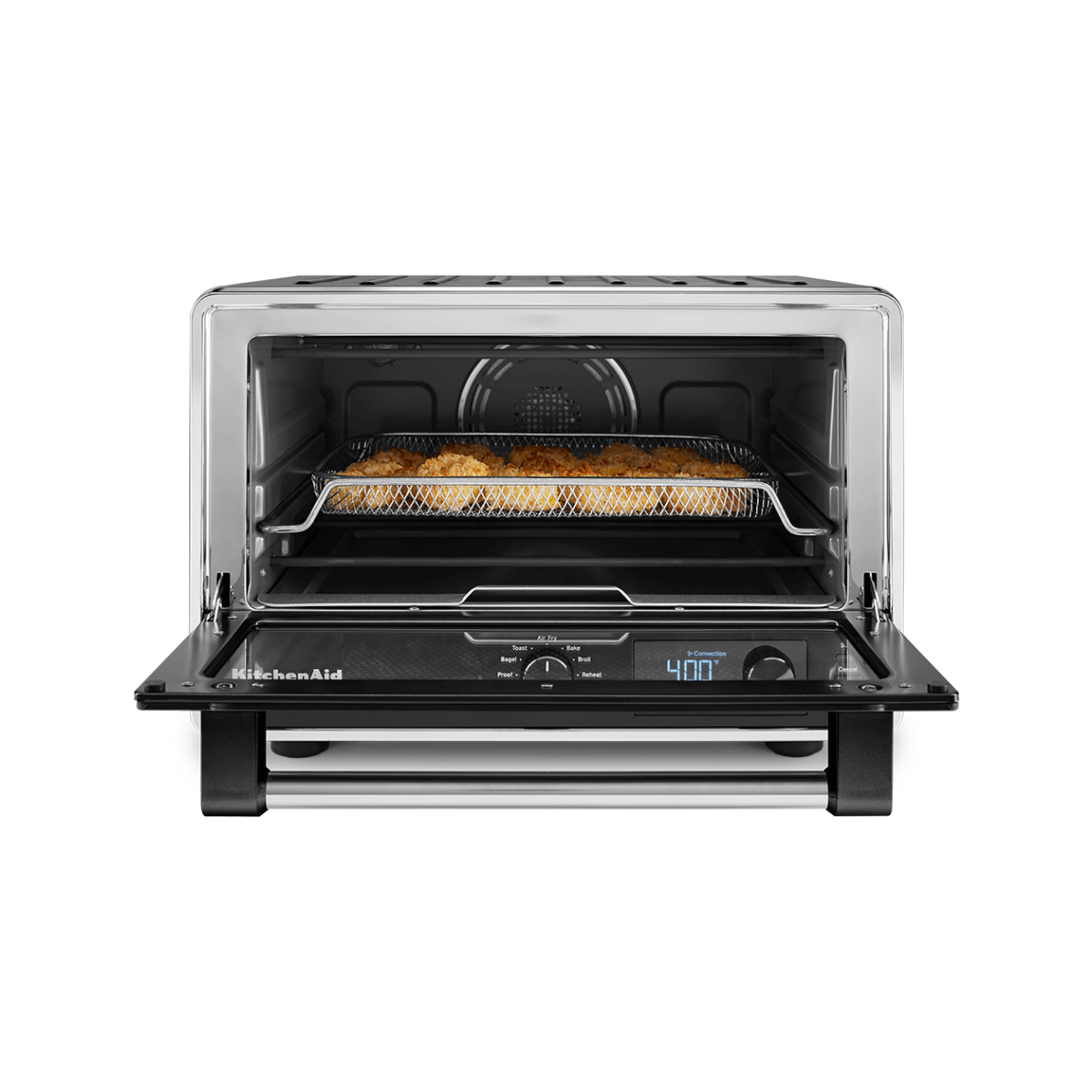 El horno de mesa digital KitchenAid® con Air Fry. Diseñado para ofrecer infinitas posibilidades saludables y frescas. Cuenta con una canasta especial para freír Sin Voltear y sistema de freído con aire de 360°es fácil preparar variedad de recetas, desde papas fritas hasta pescado delicado y mucho más. El horno brinda la máxima versatilidad para inspirar su imaginación culinaria siendo más ambiciosa y saludable.